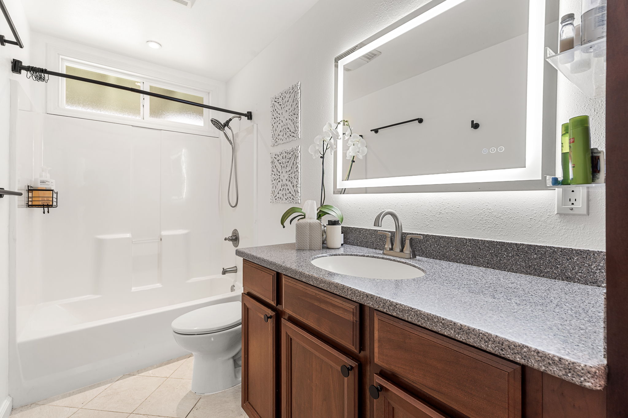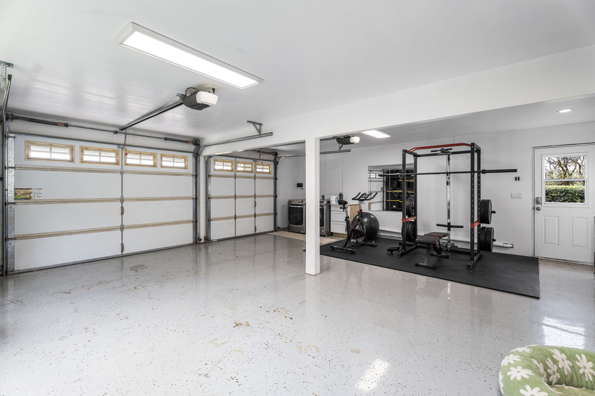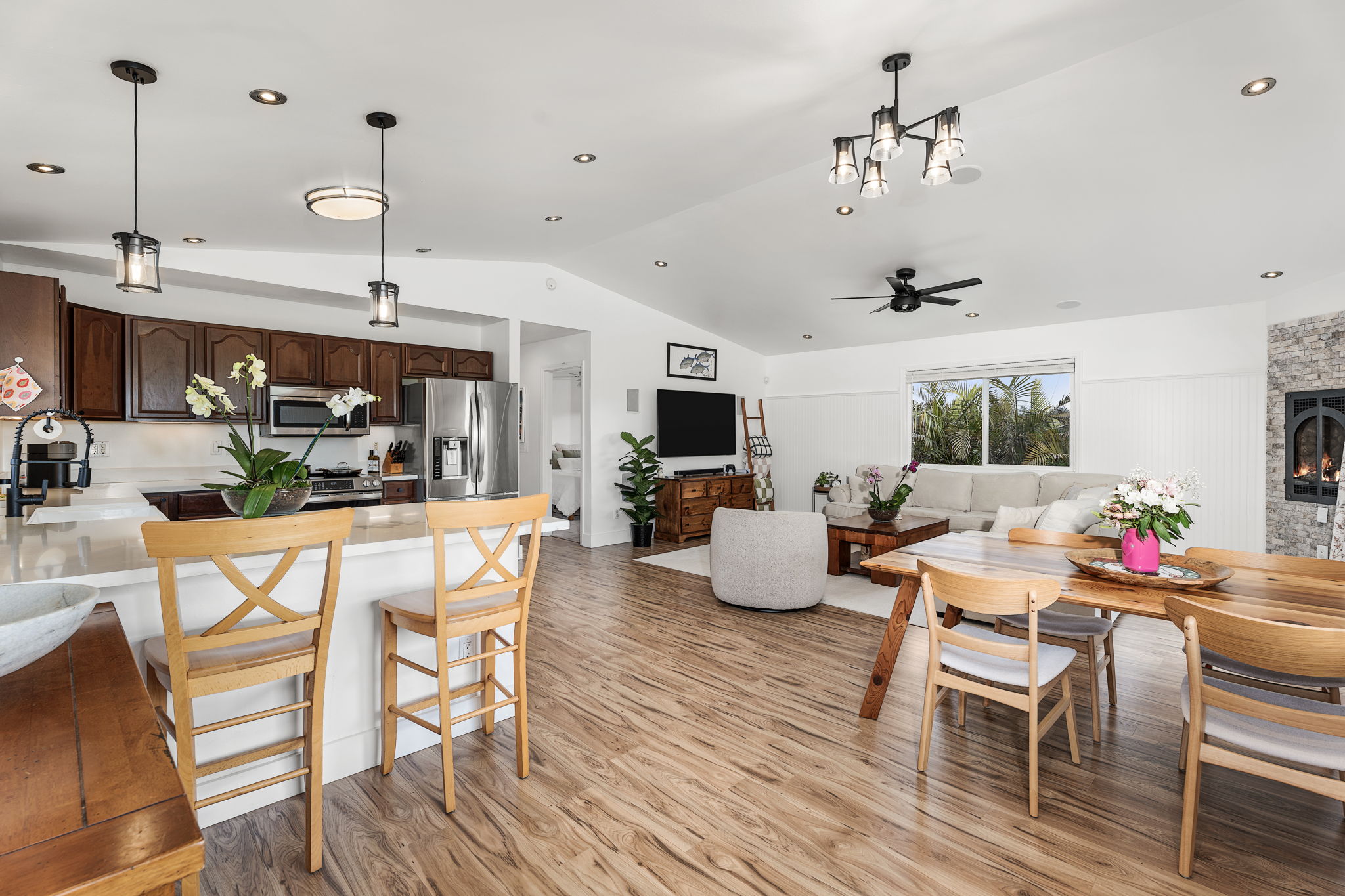 The finished 2 car garage features new drywall and a sleek epoxy floor, while a newly installed gate and fencing secure the backyard, offering privacy and peace of mind. Energy efficiency is elevated with a net-metered photovoltaic system, complemented by a gas fireplace and gas hot water system for year-round comfort and reduced utility costs.